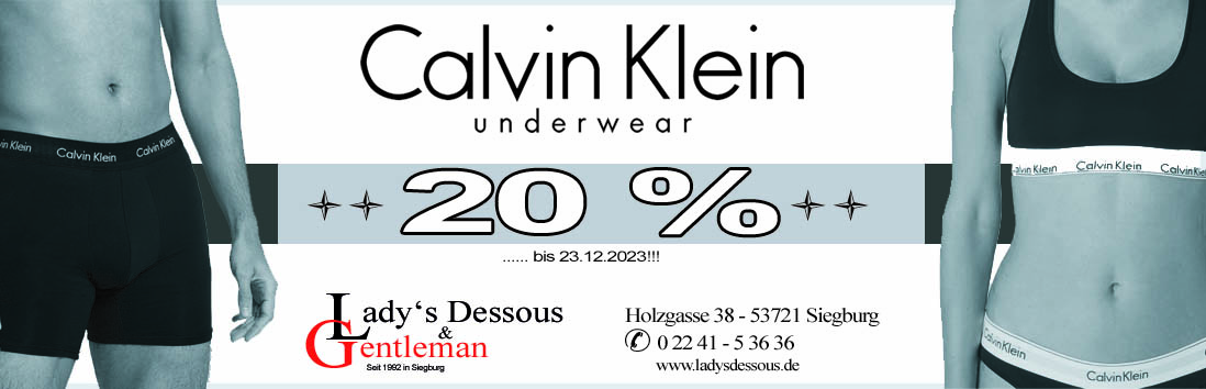 Große Calvin Klein Aktion!!! 20% auf das gesammte Calvin Klein Sortiment!!! Lady’s Dessous & Gentleman in Siegburg.